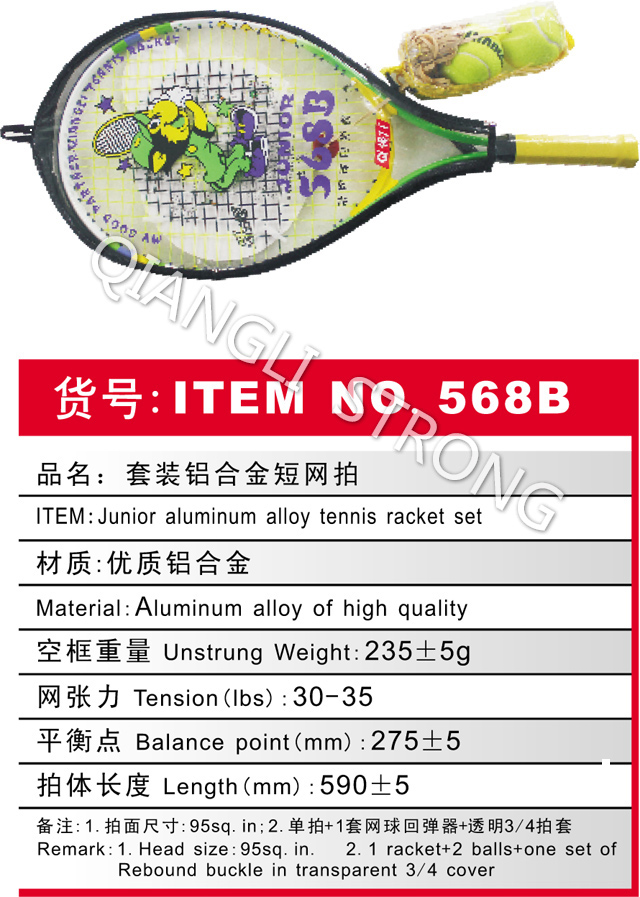 货号:ITEM NO.568B 品名:套装铝合金短网拍 item:junior aluminum alloy tennis racket set 材质:优质铝合金 materia:aluminum alloy of high quality 空框重量 unstrung weight:235+/-5g 网张力tension(lbs):30-35 平衡点balance point(mm):275+/-5 拍体长度length(mm):590+/-2 备注:1.拍面尺寸:95sq.in.;2.包装:单拍+1套网球回弹器带透明3/4拍套 remark:1.head size 95sq.in.;2.racket+2 balls+one set of rebound buckle in transparent 3/4 cover |