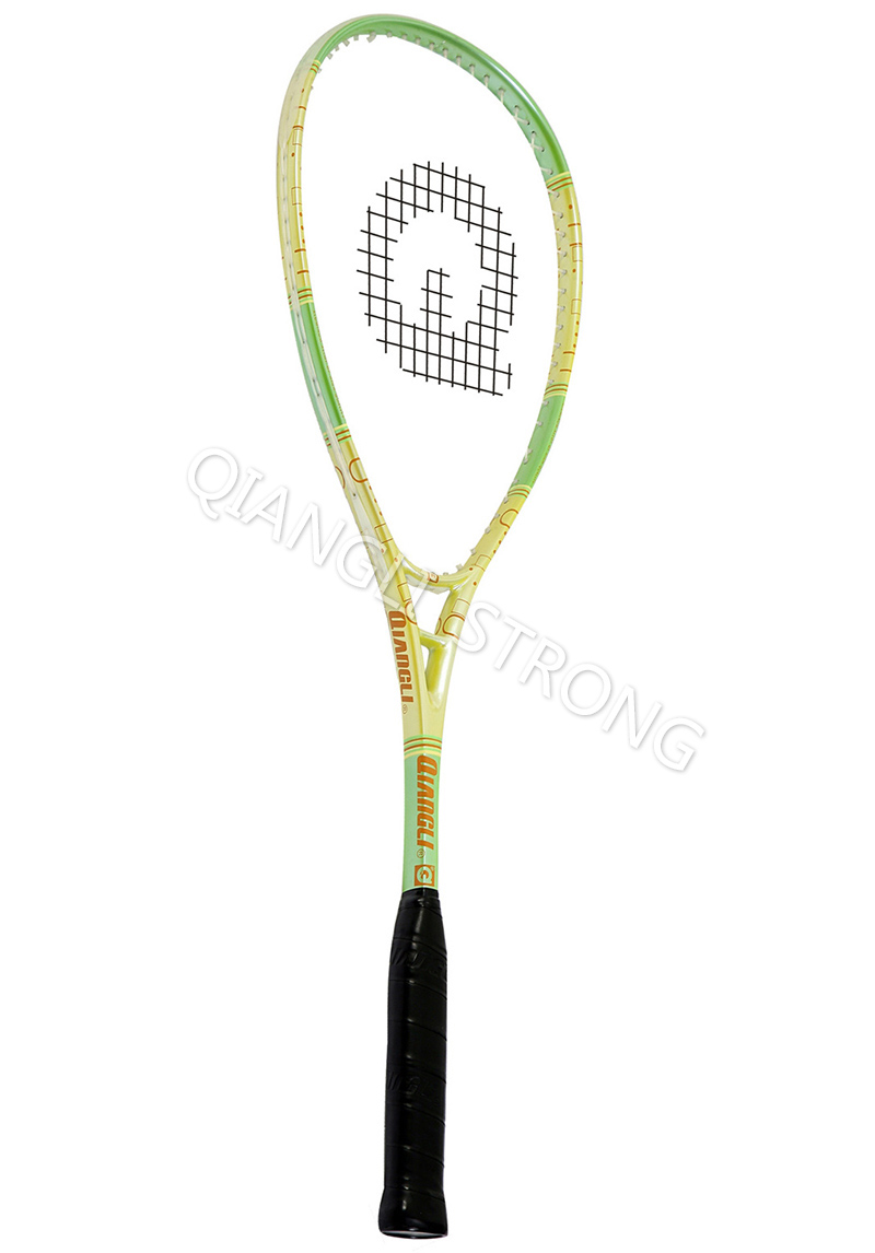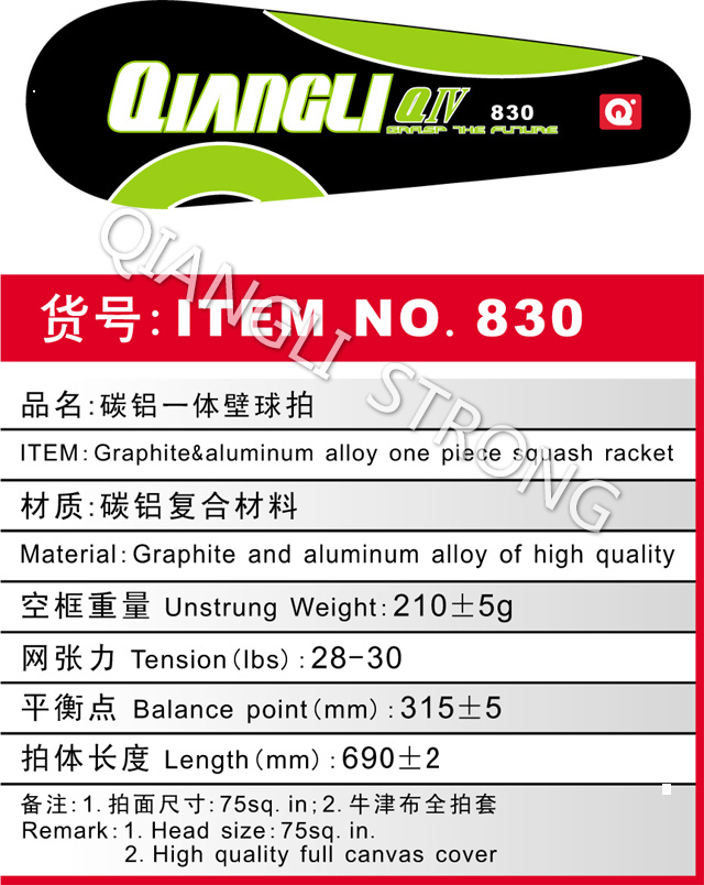 货号:item NO.830 品名:碳铝一体壁球拍 item:graphite&aluminum alloy one piece squash racket 材质:碳铝复合材料 material:graphite and aluminum alloy of high quality 空框重量Unstrung weight:210+/-5g 网张力tension(lbs):28-30 平衡点balance point(mm):315+/-5 拍体长度length(mm):690+/-2 备注:1.拍面尺寸:75sq.in.;2.牛津布全拍套 remark:1.head size 75sq.in.; 2.high quality full canvas cover