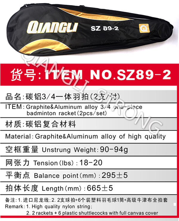 备注:1.进口高级尼龙弦线;2.2支装+一筒羽毛球(6个)+高级牛津布全拍套