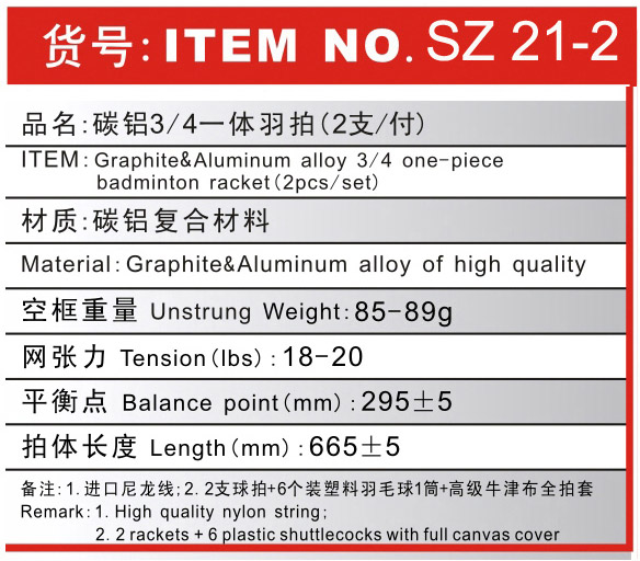 SZ 21-2 碳铝3/4一体羽拍2支/付(升级版)